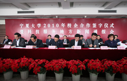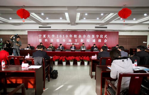 【宁夏大学新闻中心讯 黄二宁/图 翟伟/文】 12月1日下午,我校召开了2010年校企合作签字仪式暨科技服务地方新闻通报会,向社会通报了近年来我校科技服务地方工作的主要成果及学校在人才培养、科技创新、学科建设等方面所作的工作和取得的成绩。自治区经济和信息化委员会主任王永耀、宁夏军区后勤部副部长安进瑜等13家单位的领导,我校党政领导齐岳、何建国、赵利宁、许兴、王燕昌、谢应忠及学校各部门负责同志、专家学者和教师代表100余人参加了新闻通报会。通报会由校党委副书记赵利宁主持。人民日报宁夏分社、新华社宁夏分社、光明日报、中央人民广播电台、中国教育报、宁夏日报、宁夏电视台、宁夏新闻网、宁夏人民广播电台、宁夏教育电视台、银川电视台、新消息报、华兴时报、银川晚报等媒体记者到会采访。