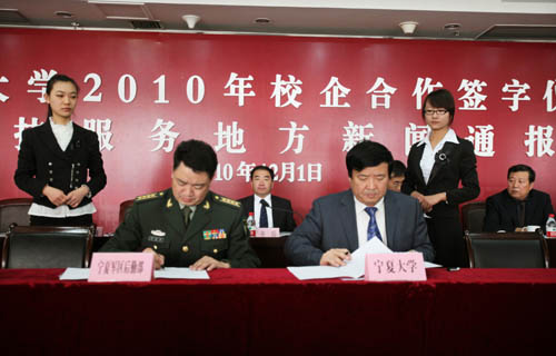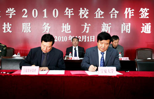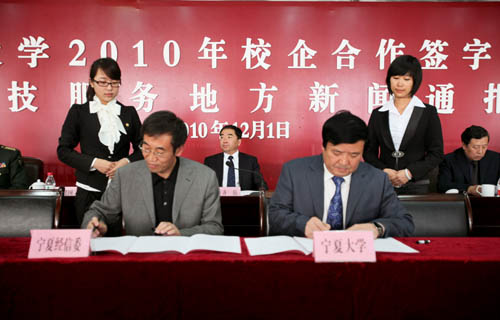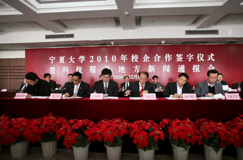 会上,我校与自治区经济和信息化委员会、宁夏军区、宁夏农垦集团有限公司、宁夏银星多晶硅有限责任公司、宁夏产权交易所、宁夏希望信息产业有限公司、宁夏宝塔石化集团有限公司、宁夏泰瑞制药股份有限公司、吴忠市金积工业园区管委、银川泰丰生物科技有限公司、宁夏青龙管业股份有限公司、银川市金河乳业有限公司等12家单位和企业签署了产学研合作基地建设协议。