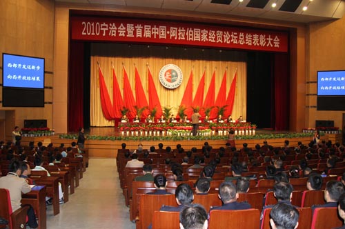 【宁夏大学新闻中心讯 翟伟图/文】10月13日上午,“2010中国(宁夏)国际投资贸易洽谈会暨首届中国-阿拉伯国家经贸论坛表彰大会”在宁夏会堂隆重举行。自治区主席王正伟出席表彰大会并讲话。自治区领导刘晓滨、蔡国英、马秀芬、李锐、袁汉民等出席会议。自治区副主席李锐主持会议并宣读表彰决定。