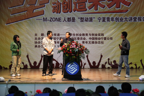 据了解,此次“宁夏青年创业大讲堂” 报告会在我校的成功举办,也标志着由共青团中央和中国移动,联合发起的“Mobile Market(移动应用商场)百万青年创业计划”在宁夏正式启动。