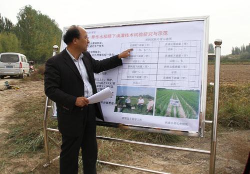 【宁夏大学新闻中心讯 黄二宁/图 翟伟/文】 10月12日上午,自治区科技厅组织专家对我校承担的自治区科技攻关项目“旱作水稻膜下滴灌技术试验研究与示范”进行阶段验收。该项目共投入资金15万。项目主持人为宁夏大学田军仓教授,课题由宁夏大学、宁夏农垦平吉堡农业发展有限公司、宁夏农机鉴定站等3家单位共同承担。