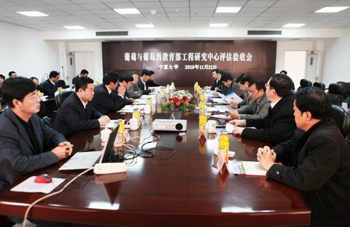 【宁夏大学新闻中心讯 黄二宁 /图 翟伟/文】 11月21日上午,葡萄与葡萄酒教育部工程研究中心建设项目评估验收会在A区综合楼10楼会议室举行。教育部评估专家组由新疆石河子大学食品学院党总支书记童军茂、西北农林科技大学葡萄酒学院副院长张振文教授等7人组成。教育部科技司高新处处长黄安国,自治区教育厅副厅长冀永强,我校校长何建国、副校长许兴,宁夏教育厅高教处处长殷骅,葡萄与葡萄酒教育部工程研究中心主任王振平教授以及科技处、农学院等相关部门负责人,与工程中心合作的企业代表等参加了会议。会议由黄安国处长主持。评估验收工作分听取汇报、现场考察和专家评议质询三个阶段进行。