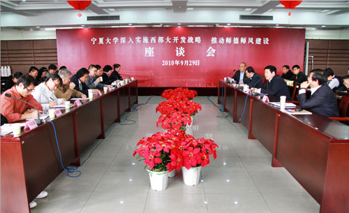 【宁夏大学新闻中心讯 张丽艳/文 黄二宁/图】为落实校党委关于深入实施西部大开发战略大学习活动的通知精神,积极推动我校师德师风建设,为建设“211工程”学校培养一支高素质的教师队伍,由我校工会、党委宣传部、人事处、教务处共同举办的教师师德师风建设座谈会于9月29日召开。校党委书记齐岳,校长何建国,副校长王燕昌,相关部门负责人,各学院党总支书记以及教师、学生代表百余人齐聚一堂,共话我校师德师风建设。校纪委书记赵维素主持了会议。