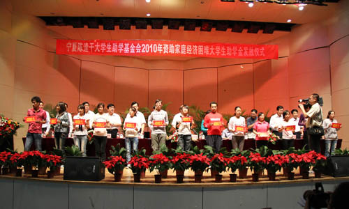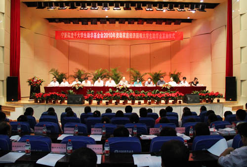 宁夏陈逢干大学生助学基金会副会长、秘书长吴文彪宣读了《关于2010年资助家庭经济困难大学生的决定》。与会领导为受助地市及学生代表发放了助学金。我校学生张亮代表受助学生在仪式上发言。