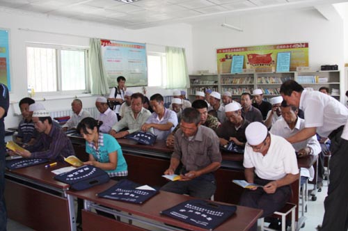 肉牛养殖户在翻阅服务团发放的资料