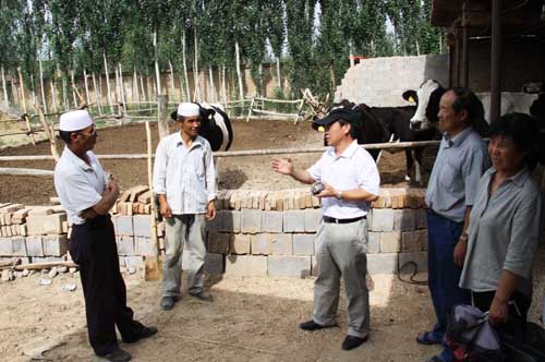【宁夏大学新闻中心讯 翟伟 图/文】为了解农村及农民的需求,为农民提供牛羊健康养殖与疾病防治方面的新技术,展示与应用新成果,为社会主义新农村建设服务,我校农学院在学校和自治区农牧厅领导的大力支持下,于7月13日上午深入西夏区兴泾镇兴盛村,并举行了牛羊健康养殖与疾病防治专家服务团启动仪式。自治区科技厅农业处副处长杨玉明、我校科技处处长李建设、农学院副院长专家团成员冯登侦、专家服务团全体成员、西夏区兴泾镇副镇长陈海霞及兴泾镇兴盛村的60余名村民参加了启动仪式。