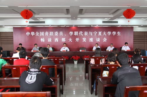 赵利宁副书记在座谈会上讲话。他首先对我国实施西部大开发战略的指导思想、基本原则、主要目标和战略意义做了阐述,并就宁夏大学学生如何更好地在新一轮西部大开发中履行好历史责任提出了三点要求:一是要增强使命感、责任感,充分认识我校在深入实施西部大开发战略中面临的新机遇、新挑战,认真学习、坚定信心,开拓进取,努力做好各项工作;二要积极行动起来,把学习西部大开发精神同爱国、爱校结合起来,在学好文化知识的同时,努力积极投身西部大开发,不断增强机遇意识、发展意识、参与意识,努力为报效祖国做出贡献;三是要在新的历史起点上奋发学习,为把宁夏大学建设成为区域特色鲜明、教学科研并重,服务地方能力较强的高水平教学研究型大学做出最大的努力。