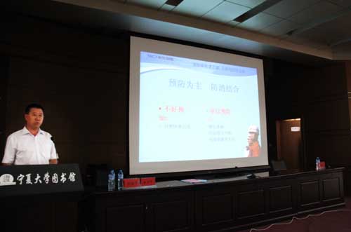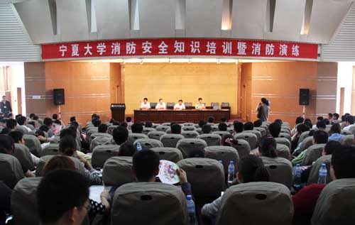 【宁夏大学新闻中心讯 翟伟 图/文】浓烟在五四广场蔓延,一群群学生有序、快速地从逸夫图书馆报告厅的各个安全通道紧急疏散…… 6月 30日下午,由校保卫处举办的“消防安全知识培训”及“消防演练”活动分别在B区逸夫图书馆报告厅和五四广场举行。自治区公安消防总队教导员李玉河、西夏区消防大队教导员徐朝辉、新华人寿保险宁夏分公司经理张振平、校保卫处处长侯文庆及全校各学生公寓楼、教室、实验室、资料室、档案馆、图书馆、大学生活动中心、食堂、电工房、仓库等场所的管理员,各学院负责安全工作的领导及学办主任、辅导员、学生义务消防员及中房物业公司保安人员共400余人参加了此次活动。