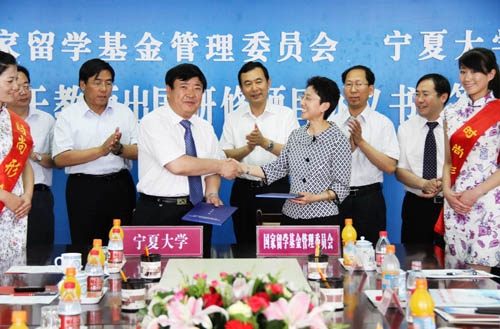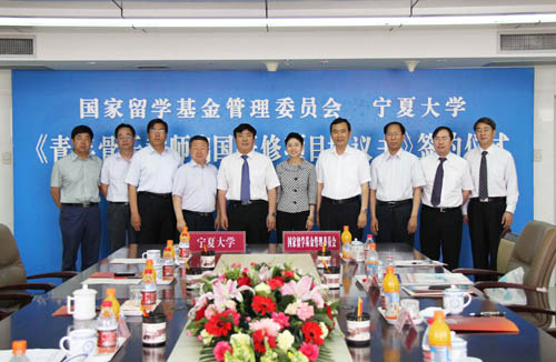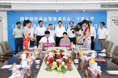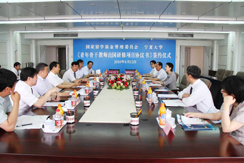 在此次会议期间,国家留学基金委刘京辉秘书长一行参观了我校,并与我校举行了“国家留学基金管理委员会、宁夏大学《青年骨干教师出国研修项目协议书》签约仪式”。自治区教育厅厅长郭虎、副厅长冀永强参加了签约仪式。根据协议,2010年双方将共同配套资助10名青年骨干教师出国留学研修,这是我校推动教师国际化能力提升,促进“211工程”学科和人才队伍建设在国际合作交流项目上的又一突破。