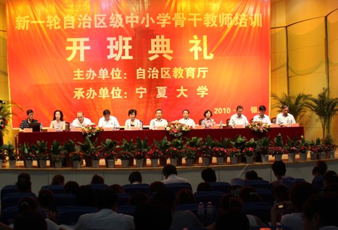 【宁夏大学新闻中心讯 曾 华 田 宁 图/文】8月6日上午,新一轮自治区级中小学骨干教师培训班开班典礼在我校音乐厅隆重举行。自治区教育厅厅长郭虎,我校党委书记齐岳,教育厅副厅长赵紫霞,我校副校长王燕昌,自治区政府教育督导室专职副主任衡鸣等领导和相关部门负责人出席和参加了开班典礼。自治区教育厅副厅长赵紫霞在会上作了动员报告,我校副校长王燕昌代表承办单位宁夏大学在会上致辞,骨干教师代表在会上发言。自治区教育厅师资处处长吴红军主持开班典礼。