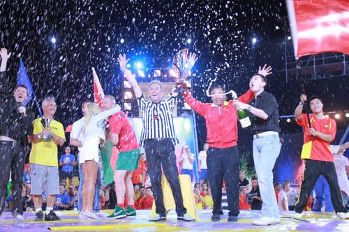 比赛共设海滩冲浪、引牛过圈、巨人争位、勇攀高峰等七个项目,每个项目都是对队员智慧、勇气的考验,和体力、耐力的挑战,银川健儿们以积极的拼抢和完美的配合使比分一路领先。勇攀高峰是整场比赛的重头戏,每队三名选手以接力的方式进行最后的比拼。中国只以一分的优势领先白俄罗斯,比俄罗斯也仅领先3分。随着总裁判长奥利弗的一声口令,中国三名队员江南、潘玉柱、马文祥如同离弦之箭直窜峰顶。当中国队员江南第一个攀上顶峰的瞬间,整个赛场立刻沸腾了。中国终于赢得了这久违的胜利,队员们拥抱到了一起,喜极而泣,在法的华人华侨,中央电视台的全体工作人员无不欢欣鼓舞也加入了狂欢的行列,就连很多法国人都为中国的胜利而兴奋。人们以不同的方式向银川健儿致敬,为中国喝彩。