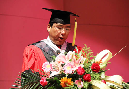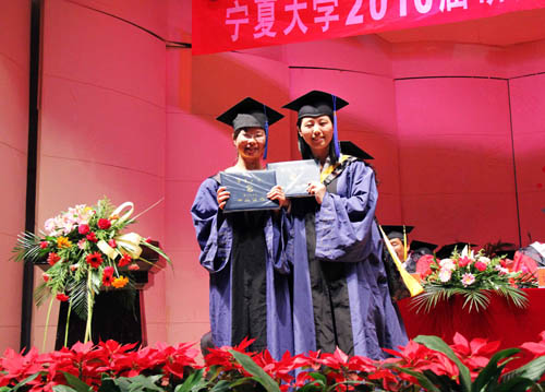 宁夏大学校长、校学位评定委员会主席何建国教授在欢快的乐曲声中,为获得博士学位的9名研究生和610名获得硕士学位的研究生一一颁发了学位证书,援正流苏。