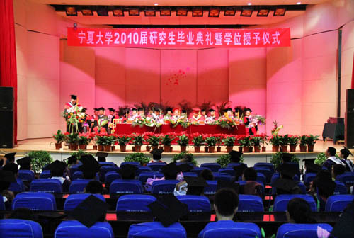 【宁夏大学新闻中心讯黄二宁/图 张丽艳 田宁/文】又是一个美丽的夏天,又是栀子花开的季节,又是离别笙箫渐起的日子,又到了离别的季节。6月9日上午,我校2010届研究生毕业典礼暨学位授予仪式在音乐学院音乐厅隆重举行。校党委书记齐岳,校长何建国,副校长许兴,王燕昌、谢应忠以及学校各有关部门、各学院(部、中心)负责同志和部分研究生导师参加了毕业典礼。9名获得博士学位和610名获得硕士学位的毕业生即将带着母校和师长的重托,奔赴祖国各地,开始新的人生旅程。毕业典礼由副校长王燕昌主持。