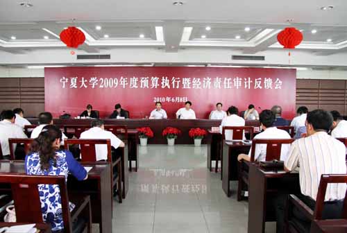 【宁夏大学新闻中心讯 黄二宁/图 翟伟/文】我校2009年度预算执行暨经济责任审计于近日结束。6月8日,自治区审计厅审计组在我校校本部A区综合楼六楼会议室召开宁夏大学2009年度预算执行暨经济责任审计反馈会。自治区审计厅副厅长胡仲秋,自治区审计厅行政事业处副处长、宁夏大学审计组组长蒋辉,宁夏大学审计组主审王永刚出席经济责任审计反馈会。校党政领导齐岳、何建国、赵维素、王燕昌、李星、谢应忠、张成,各学院、各部门负责人参加了反馈会。反馈会由审计厅行政事业处处长高晓红主持。