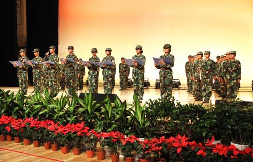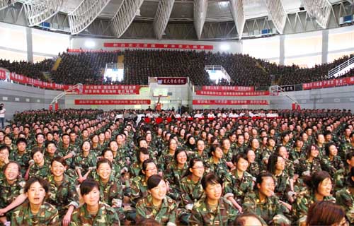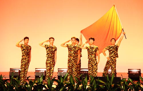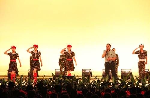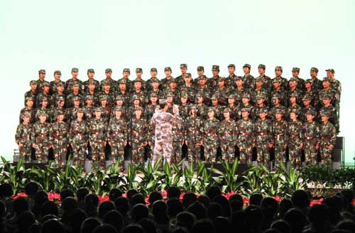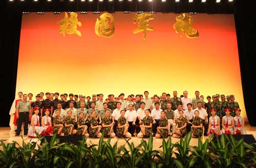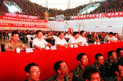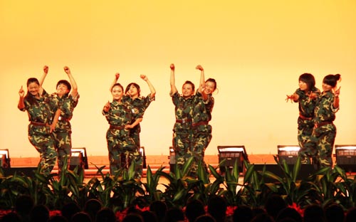 【宁夏大学新闻中心讯 黄二宁/图 翟伟/文】7月23日下午,我校在大学生活动中心隆重举行庆祝学生军训工作25周年暨2010年军训文艺汇演。校党委书记齐岳、校长何建国、校党委副书记赵利宁、副校长许兴、驻校选培办主任何义时大校、20余名承训教官及5000余名参训师生共同观看了文艺汇演。