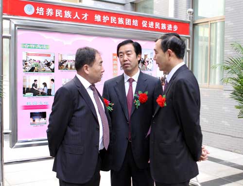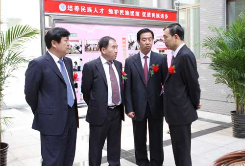 【宁夏大学新闻中心讯 黄二宁/图文】5月28日清晨,前来参加我校民族预科教育学院成立二十周年暨全国高校民族预科教育基地建设五周年庆典大会的自治区党委副书记于革胜,在庆典大会开始前,由我校党委书记齐岳、校长何建国等领导陪同,兴致勃勃地观看了我校民族预科教育宣传展板和我校“主动融入社会、服务社会、积极引领社会”的主题宣传展板。于革胜副书记一边观看,一边与我校领导亲切交谈,了解我校民族预科教育的发展和学校相关工作的介绍。他对我校民族预科教育学院建院二十年来取得的成绩给予充分肯定,勉励我校要把民族预科教育办成全国民族高等教育的创新基地、全国民族团结进步的示范样板、少数民族学生的成长摇篮和全国省部共建的办学典范。最后,于革胜副书记提议与我校领导及在场的其他领导一同合影留念。