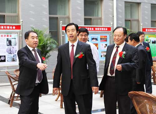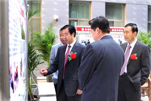 于革胜副书记在我校齐岳书记的陪同下观看服务地方、经济主题宣传展板
