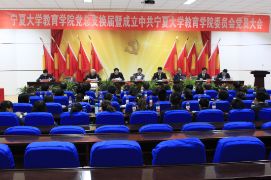【宁夏大学新闻中心讯 教育学院 柴林姗 魏娟宁】为落实校党委《中共宁夏大学委员会关于在部分学院实行分党委制的工作方案》文件精神,教育学院党总支换届暨成立中共宁夏大学教育学院委员会党员大会于11月3日在文科楼东报告厅隆重召开。校党委副书记王燕昌、党委组织部副部长王洪武、纪检委正处级纪检员陈少念到会指导,学院党总支书记高石钢、院长戴联荣、副书记张翼、副院长马建宏、前党总支书记鲁晋、离退休人员代表周德正、民主党派代表曾祥岚、无党派人士代表王安全出席大会,学院99名党员参加大会。
