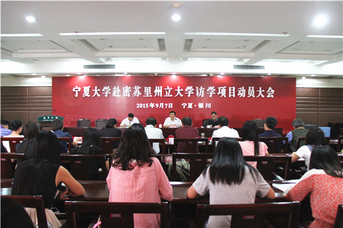 【宁夏大学新闻中心讯 国际合作处 冯汝源/文 党委宣传部 龚旭峰/图】9月7日下午,我校举行了“宁夏大学赴密苏里州立大学访学项目动员大会”暨50名学生和10名教师赴密苏里州立大学访学行前教育。何建国校长、谢应忠副校长和相关部门负责人参加了会议。