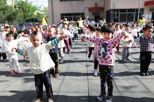 齐岳书记、张成副校长还兴致勃勃地观看了小朋友们所做的广播体操,并走到小朋友中间,与小朋友携手联欢,整个幼儿园沉浸在一片欢乐的海洋中。