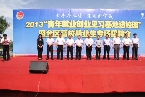 【宁夏大学新闻中心讯 曾华 陈佩 张鹏报道】为了缓解就业压力,帮助高校毕业生通过岗位见习提升就业能力,实现充分就业。5月29日下午,2013年“青年就业创业见习基地进校园”暨全区高校毕业生专场招聘会在宁夏大学校本部金波湖畔举行。自治区副主席姚爱兴,自治区政府副秘书长崔晓华,自治区教育厅副厅长冀永强,自治区人力资源和社会保障厅党组成员、公务员局局长刘智谋,宁夏大学党委书记齐岳、副书记赵利宁及相关厅局负责人出席活动。自治区团委书记马金元主持活动。