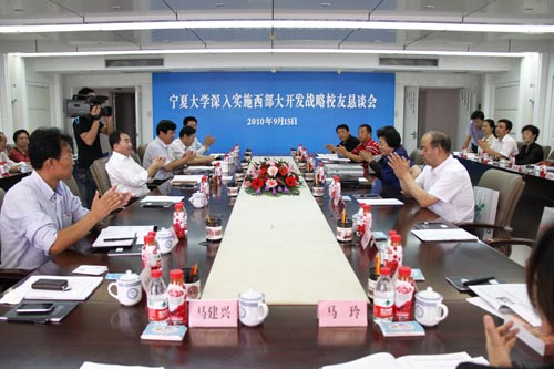 【宁夏大学新闻中心讯 黄二宁/图 田 宁/ 文】 9月15日,在宁夏深入实施西部大开发战略之际,毕业于各个时期、分布在各个行业的15名宁夏大学知名校友代表与退休教师代表欢聚在宁夏大学校园,庆祝宁夏大学建校52周年并在A区主楼11楼召开了宁夏大学深入实施西部大开发战略校友恳谈会。原自治区政协副主席金晓昀、自治区招标局局长汤效禹、自治区教育厅正厅级巡视员张义康等出席了恳谈会。校党委书记齐岳、校长何建国、副校长谢应忠及相关部门负责人参加了恳谈会。恳谈会由谢应忠副校长主持。