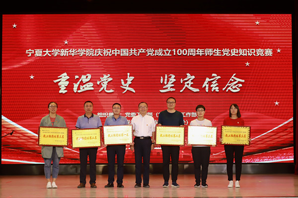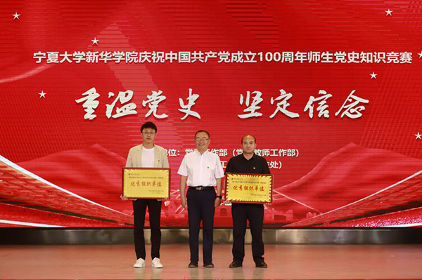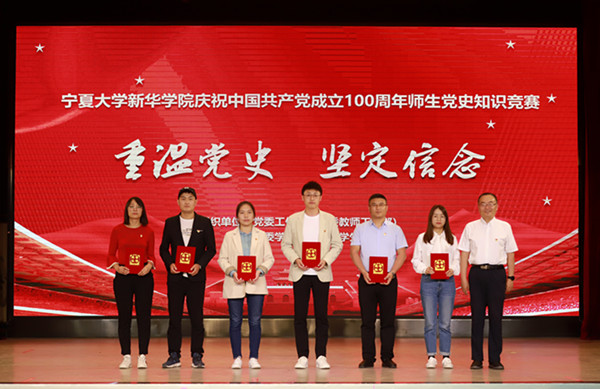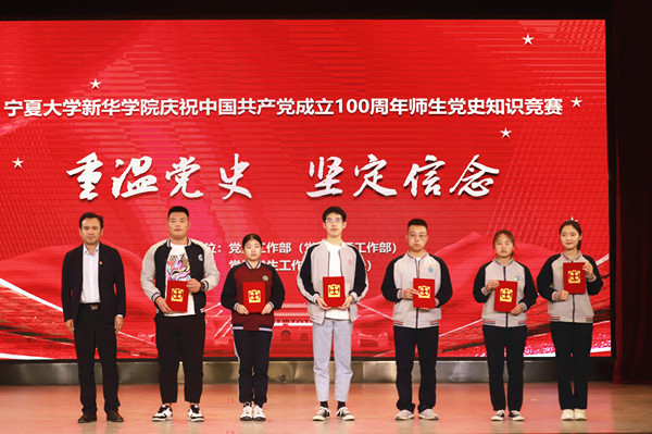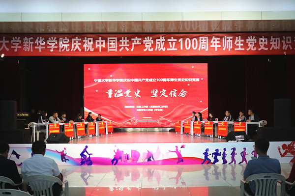 【宁夏大学新闻中心讯 新华学院】为激励广大师生学史明理、学史增信、学史崇德、学史力行,把“学党史”和“悟思想”贯通起来,5月26日,新华学院举办“重温党史、坚定信念”——庆祝中国共产党成立100周年师生党史知识竞赛,寓教于乐、重温历史。新华学院党委书记、政府督导员杨文刚,副院长赵永生,直属教工党支部书记,各系党总支书记及师生党员代表观看了比赛。
