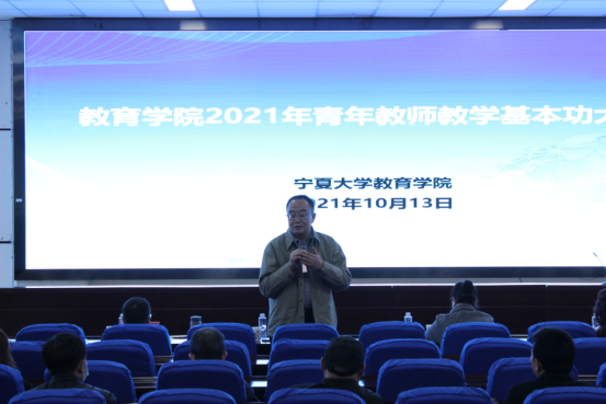 【宁夏大学新闻中心讯 教育学院】为深入学习贯彻习近平总书记“七一”重要讲话精神,落实全国教育大会精神及中共中央、国务院《关于全面深化新时代教师队伍建设改革的意见》要求,10月13日下午,教育学院2021年度青年教师教学基本功大赛在文荟楼东报告厅举行。本次大赛由王岩森、赵智宏、王安全、王淑莲、侯建军等五位教授担任评委,由焦岩岩副院长主持活动。