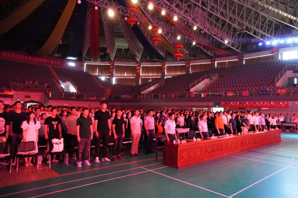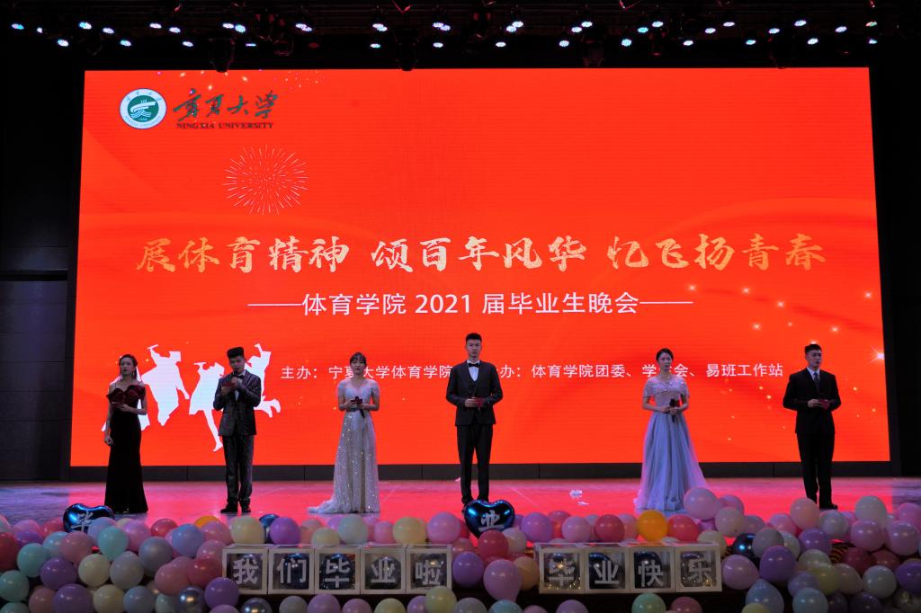 【宁夏大学新闻中心讯 体育学院】6月5日,体育学院在大学生活动中心举行“展体育精神 颂百年风华 忆飞扬青春”体育学院2020年度学生表彰大会暨2021届毕业生晚会。校党委常委、宣传部部长张立杰,党委组织部副部长李琦,学工部副部长、学生处副处长张翼,宁夏大学场馆管理服务中心、国家大学生文化素质教育基地副主任常江,体育学院党委书记陈晓敏,体育学院院长咸云龙,体育学院党委副书记严津,体育学院副院长徐赟,体育学院副院长马兆明出席晚会,学院师生与各兄弟学院学生代表参加晚会。