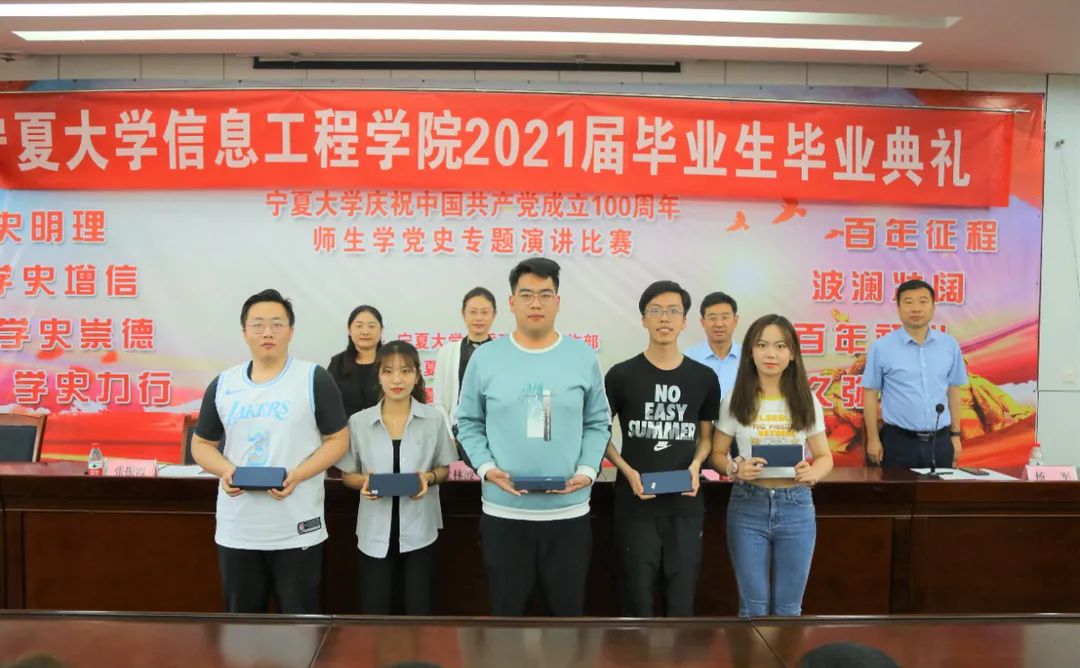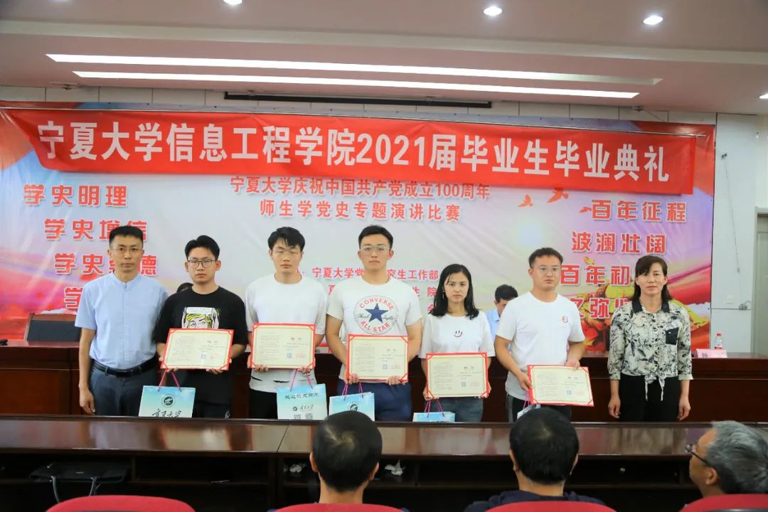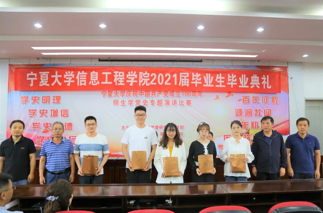 冯锋在致辞中表示,希望同学们走向社会后能够愈挫愈勇,在工作中理论联系实际,不畏艰难险阻,勇担时代使命,把小我融入大我,勇立潮头、奋勇搏击,在祖国最需要的地方奏响新时代的青春之歌;杨军宣读了信息工程学院2021届本科生、硕士研究生优秀毕业生表彰决定及信息工程学院2021届毕业生校友联络员名单,他希望学院校友联络员能够搭建与母校之间有效的互动平台,促进学院和校友的共同进步;张振霞宣读了2021届毕业生升学学生名单,她希望免推研究及考博、考研成功同学在未来的求学路上再接再厉,再创佳绩;与会教师为优秀毕业生、升学学生及校友联络员分别颁发了奖品、纪念品和证书。