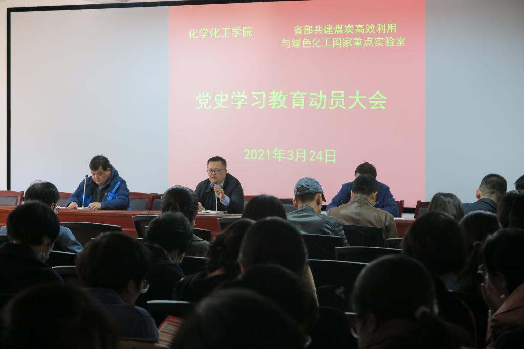 【宁夏大学新闻中心讯 化学化工学院】为贯彻落实关于开展党史学习教育的部署和要求,动员广大院室教职工统一思想、提高认识、扎实推进党史学习教育落到实处,3月24日,化学化工学院召开院室党史学习教育动员大会,结合学院发展实际,对院室党史学习教育工作进行动员部署。学院党委书记高继明同志主持会议,全体教职工参加动员会。