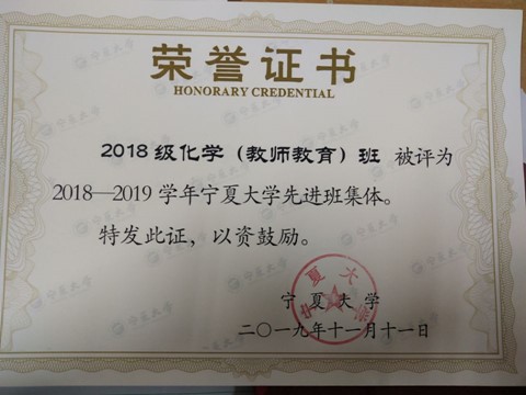 2018级化学(教师教育)1班一直秉承“勤奋、博学、求索、笃行”的支部宗旨,锐意进取,开拓创新。团支部先后荣获2018年度宁夏大学五四红旗团支部,2018-2019学年宁夏大学先进班集体,2019-2020学年宁夏大学先进班集体等荣誉称号。班级里有8名同学参加“青年马克思主义者培训班”,16个积极分子,6名正式党员,3个预备党员。团支部自2018年9月成立以来以弘扬中国共产党优良党风为目标,全力开展班级党风建设,全体团员坚持把思想政治理论学习作为重点,团支部各团员青年有端正的学习态度,形成了良好的学风班风。