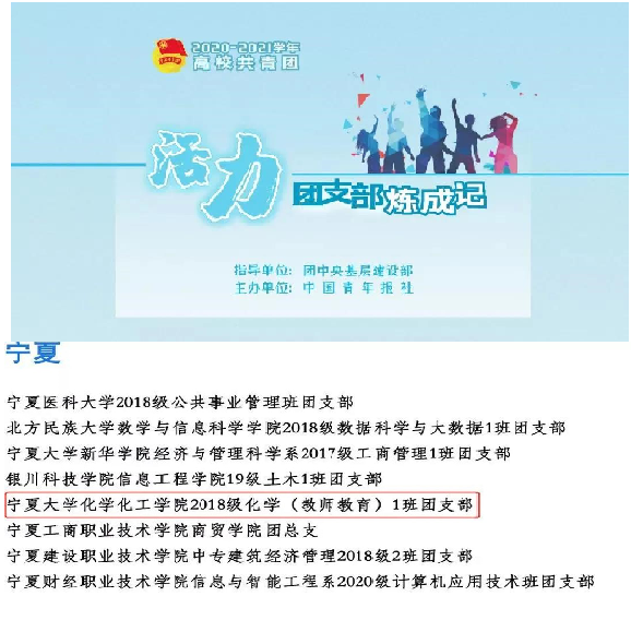 【宁夏大学新闻中心讯 化学化工学院】为深入贯彻落实“全团大抓基层”、“全团抓学校”部署,深化高校共青团改革,强化“一切工作到支部”理念,在团中央基层建设部指导下,中国青年报社开展“活力团支部炼成记”2020—2021学年高校活力团支部遴选及展示活动。6月23日,中国青年报发布2020—2021学年高校活力团支部名单,我校化学化工学院2018级化学(教师教育)1班团支部获选。
