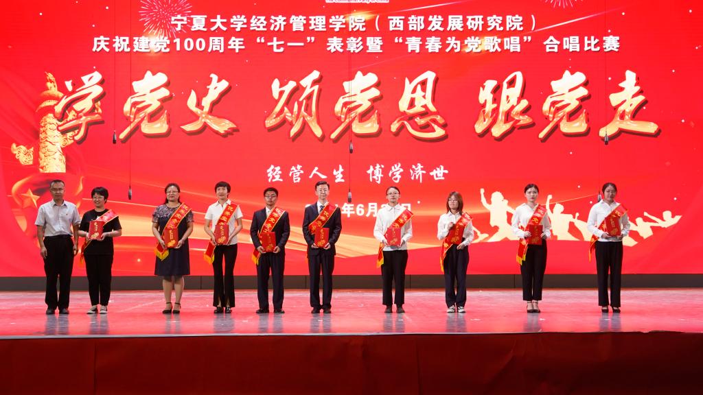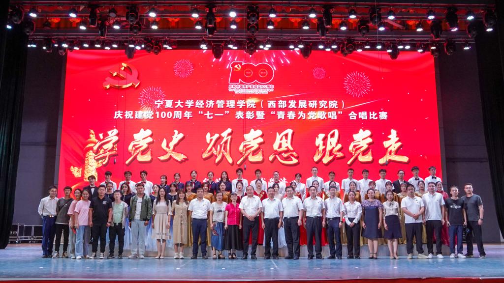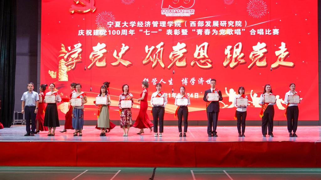 【宁夏大学新闻中心讯 经济管理学院】为庆祝中国共产党成立100周年,充分发挥先进典型表率示范作用,激励全院党员及师生员工奋发进取、担当作为,6月24日,经济管理学院(西部发展研究院)庆祝建党100周年“七一”表彰暨“青春为党歌唱”合唱比赛于宁夏大学文萃校区大学生活动中心举行。经济管理学院(西部发展研究院)党委书记朱伟,院党委副书记、院长杨国涛,党委副书记程胜利、马建宏,院党委委员、副院长仇娟东,学院党员教师,全体研究生、本科生到场参与本次活动。大会由马建宏主持。