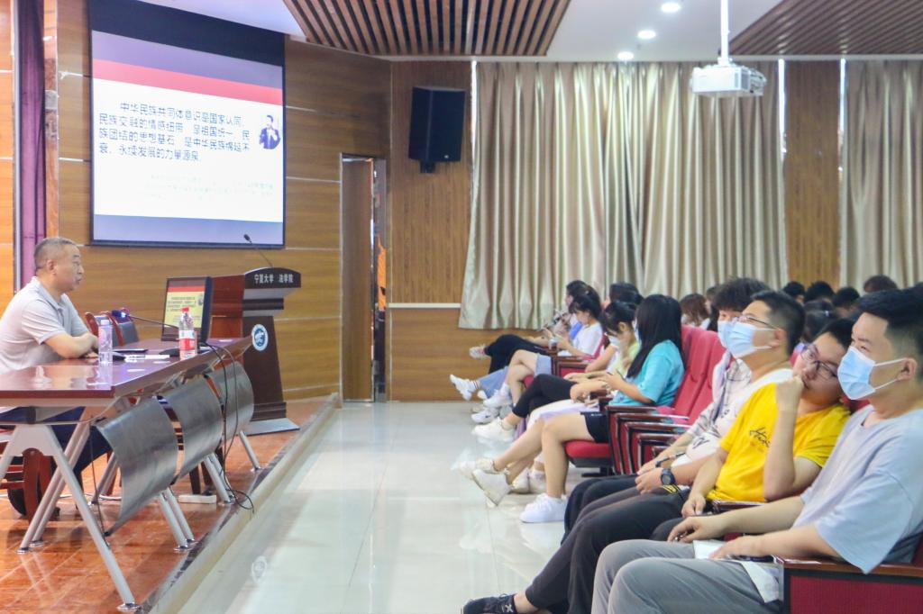 【宁夏大学新闻中心讯 法学院】为深入学习贯彻习近平总书记关于民族工作的重要论述,认识铸牢中华民族共同体意识的现实意义。6月24日,法学院于文荟楼模拟法庭组织开展了以“传承党的百年光辉史基因,铸牢中华民族共同体意识”为主题的专题讲座。自治区宣讲团成员、法学院院长吕耀军做了报告,学院本科生、硕士研究生三百余人到场聆听。