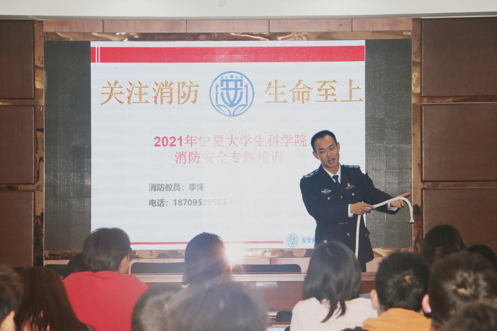 【宁夏大学新闻讯 生命科学学院】为进一步增强师生的安全防范意识,提高师生消防技能,4月16日,生命科学学院举办2021年度春季学期实验室消防安全专题培训班,培训特邀全国安全健康教育网宁夏站消防宣传科科长李博主讲,学院党委副书记何彦平主持培训班。