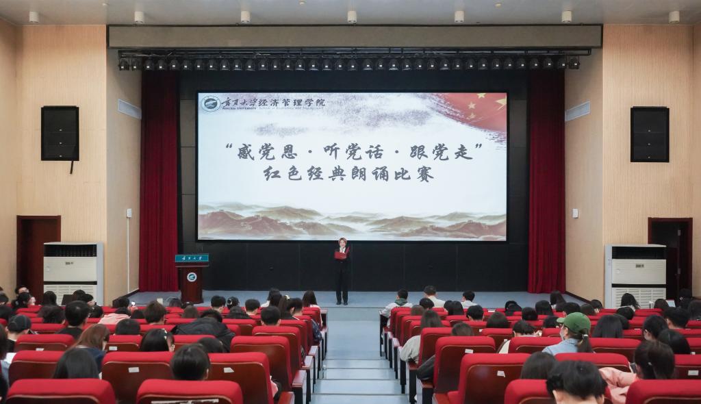 【宁夏大学新闻中心讯 经济管理学院】华夏四月,党旗迎风飘扬。4月27日晚,经济管理学院“感党恩•听党话•跟党走”红色经典朗诵比赛在科技楼报告厅顺利开展。经济管理学院团委副书记张轲尚、马利君、谭彪担任评委,学院2020级本科生到场参加。