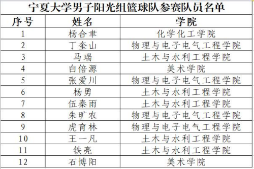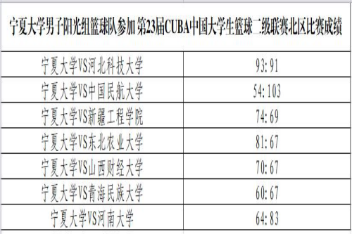 【宁夏大学新闻中心讯 体育学院】在刚刚结束的第23届CUBA中国大学生篮球二级联赛北区比赛中,宁夏大学男子阳光组篮球队充分发挥不畏强手、奋力拼搏、敢于争先、永不言败的运动精神,荣获本次比赛第十二名的佳绩,实现了本赛事历史性突破。