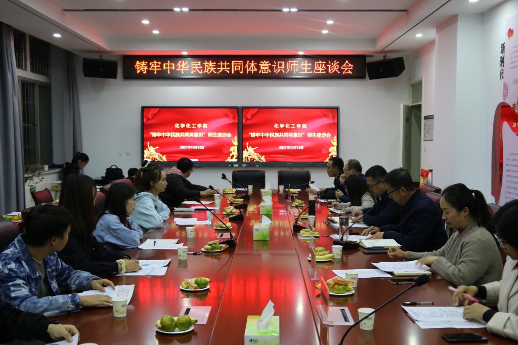 【宁夏大学新闻中心讯 化学化工学院】10月12日晚上,化学化工学院在知化楼102会议室举行了“铸牢中华民族共同体意识”师生座谈会。学院党委书记高继明、党委副书记倪彬、学院团委书记、学生工作办公室主任马丽蓉,辅导员马洁、吕乐,2020级、2021级班主任代表邢永雷、高瑞丽出席,学院各民族同学代表参加,此次会议由倪彬主持。