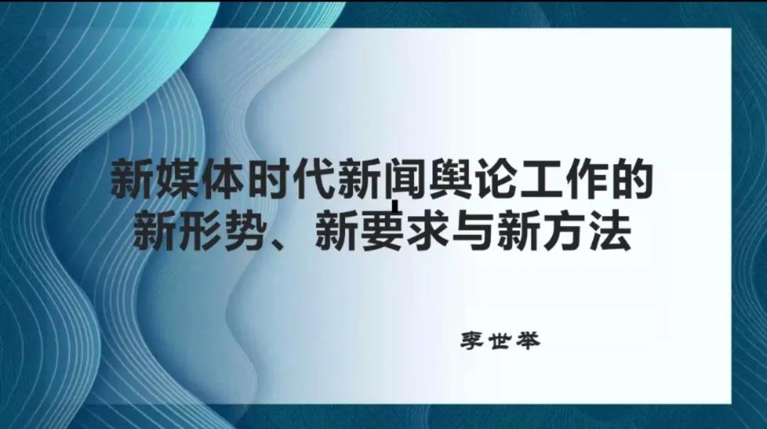 李世举从新媒体时代新闻舆论工作的新形势、新要求和新方法三个方面展开讲解。李世举分析了新媒体时代新闻舆论工作中的特点,指出随着移动传播技术的不断发展,舆论环境越来越复杂,新闻工作者要全面把握党对新闻舆论工作的新要求,坚持党性与人民性的统一,坚持正确舆论导向,坚持正面宣传为主,敢于向虚假新闻和错误思想亮剑,明辨是非,尊重事实。李世举阐述了新时代新闻舆论工作的新方法,他强调,新媒体时代是一个用户为王的时代,树立媒体品牌意识、明确用户导向成为构建新型传播关系中重要的一环,要探索生产多元化产品,“从切口去做硬新闻”;记者应选择反映时代焦点的重大题材,努力践行“四力”,创新传播手段,讲好中国故事。