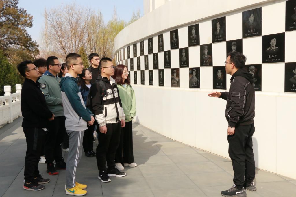 全体党员在烈士墓碑前进行诗歌朗诵《在烈士墓前》,学生辅导员吕乐向同学们讲述开国大典、抗美援朝和对越自卫反击战故事和烈士的英勇事迹。