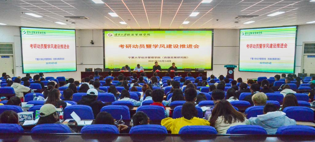 【宁夏大学新闻中心讯 经济管理学院】为创建热爱学习、积极考研的学习新风尚,10月14日晚,经济管理学院在贺兰山校区文荟楼东报告厅开展了考研动员暨学风建设师生交流会。经济管理学院党委副书记程胜利、经济管理学院学生工作办公室辅导员艾萨·阿尤普、孙文元、禹文杰,2019级、2020级、2021级全体学生干部、班团干部、学生党员、宿舍长参会。会议由艾萨·阿尤普主持。