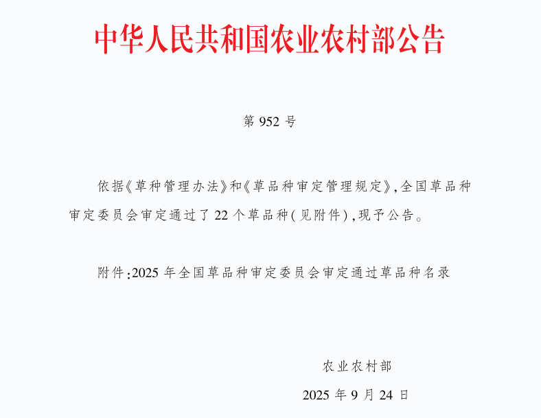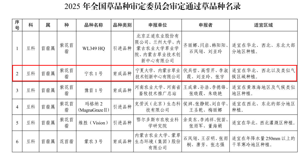 “宁农1号”紫花苜蓿新品种历经多年系统选育,具备产量高、抗旱性强、营养丰富等优良特性,尤其适宜在西北、华北等干旱、半干旱地区推广种植。该品种通过此次国家审定,标志着其适应性、生产性能与营养价值均获权威认可,将为区域饲草产能提升和草畜产业高质量发展提供有力品种支撑。