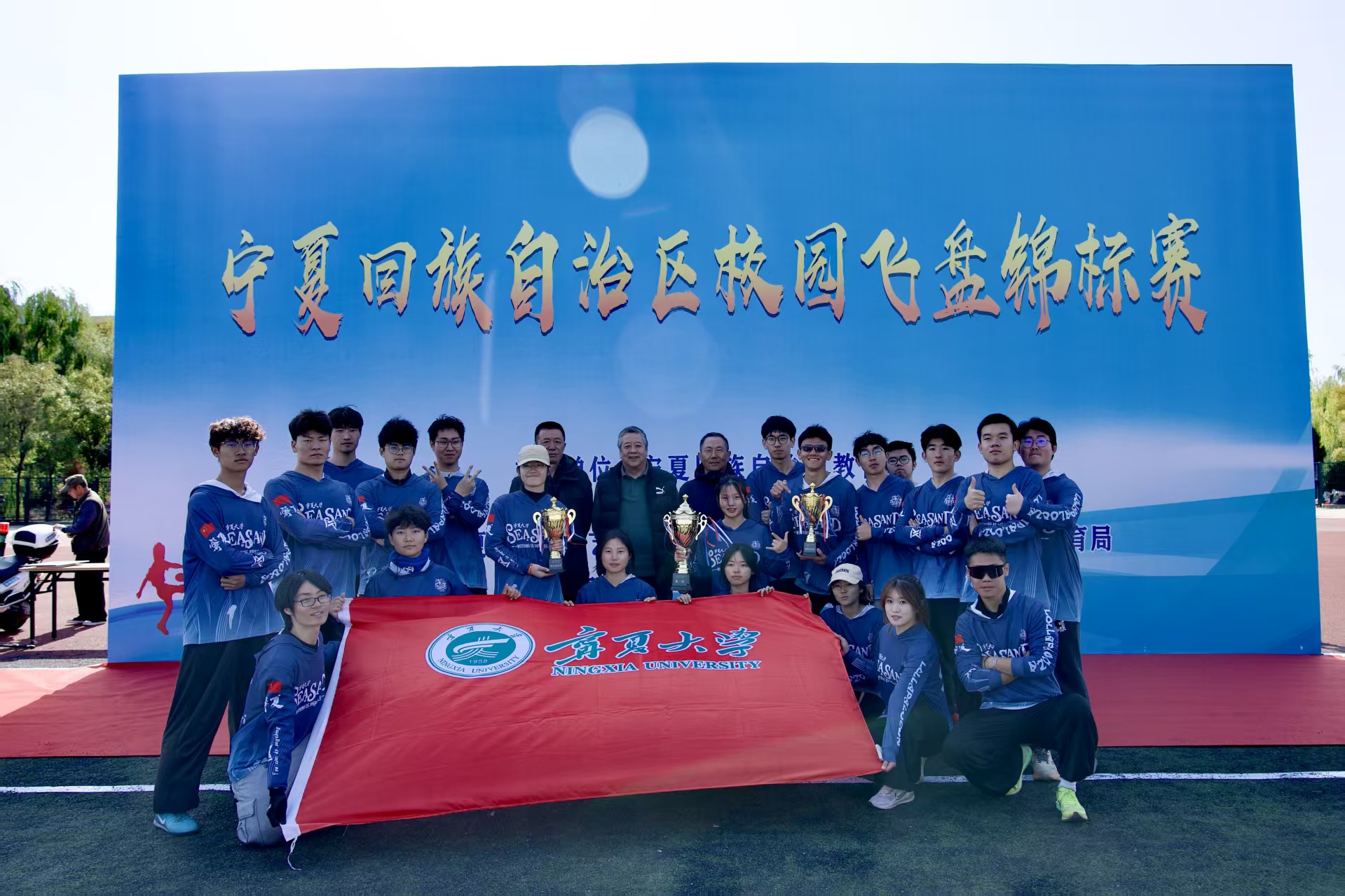【宁夏大学新闻中心讯 体育学院】10月25至26日,由宁夏回族自治区教育厅主办,宁夏学生体育艺术联合会、青铜峡市人民政府、青铜峡市教育局联合承办,青铜峡市职教中心协办的自治区校园飞盘锦标赛在青铜峡市开赛。由我校体育学院党总支书记张守荣担任领队、马亦兵老师担任教练、6个书院9个学院21名同学组成宁夏大学飞盘队参赛。