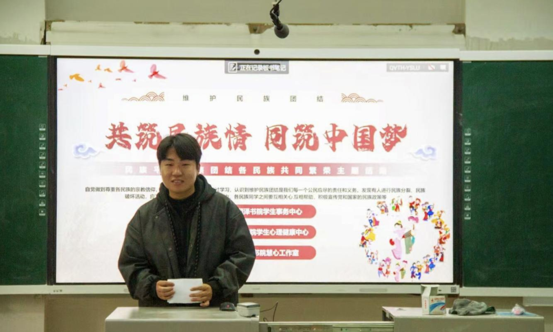 在民族理论政策学习环节,主持人以贴近生活的案例,分享了不同民族之间团结互助、共同成长的动人故事,使理论内容更加生动亲切,进一步深化了同学们对“中华民族一家亲”理念的认同。