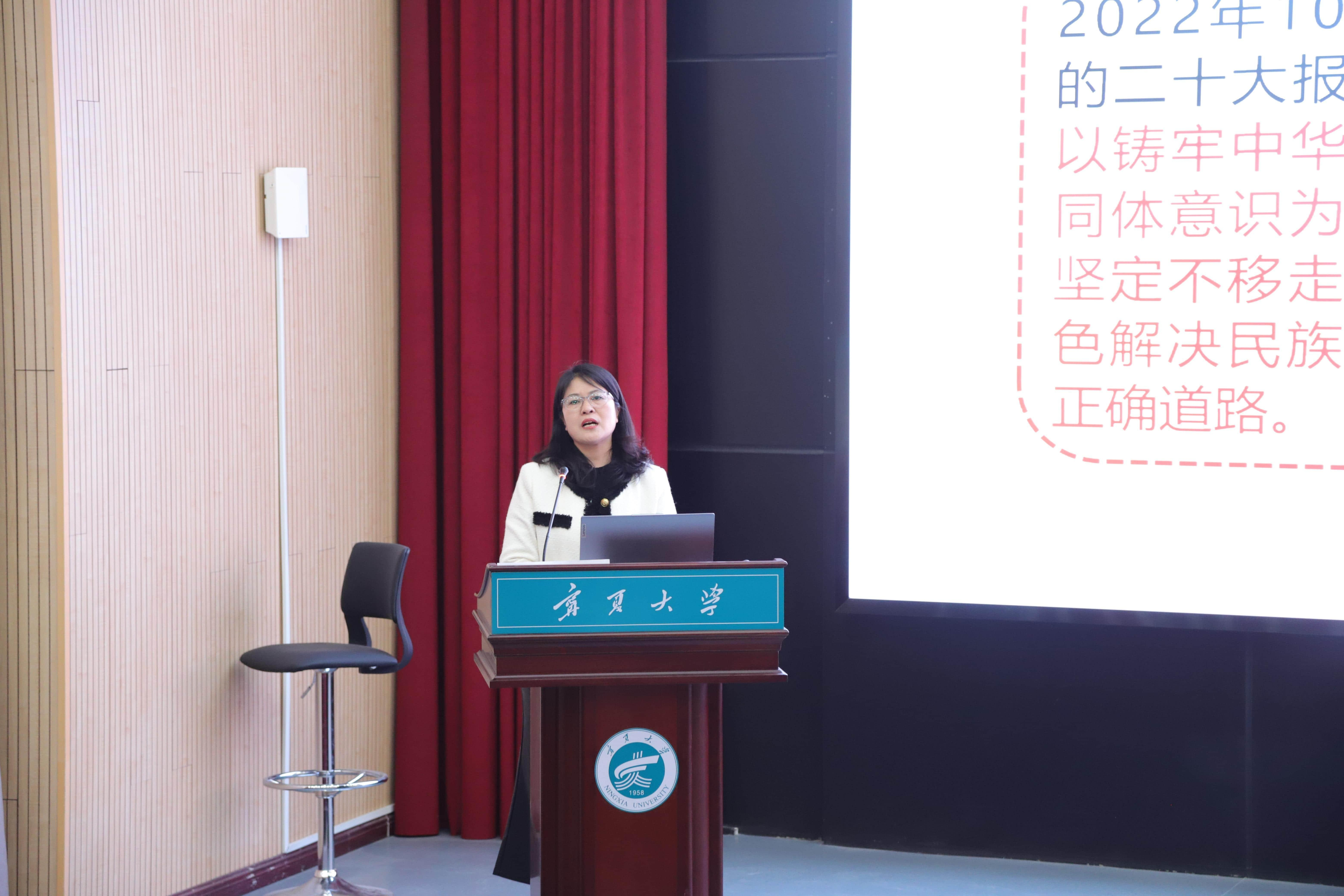 【宁夏大学新闻中心讯 鼎新书院】为引导青年学生厚植家国情怀、强化使命担当,11月24日晚,鼎新书院“青春之歌”讲堂特邀铸牢中华民族共同体意识宣讲团王换芳教授作专题讲座。书院师生代表齐聚现场,共同聆听这场兼具理论深度与实践温度的思想盛宴。本次讲座由书院党委副书记黄旭兴主持。