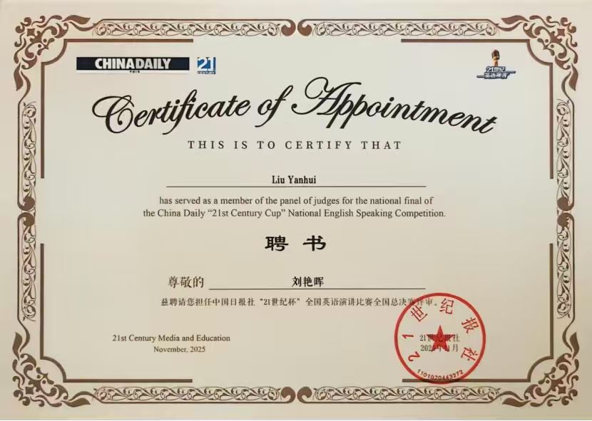 【宁夏大学新闻中心讯 人文与民族学部】11月13日至17日,第30届“21世纪杯”全国英语演讲比赛暨第七届“一带一路”青少年英语比赛全球总决赛在浙江杭州落下帷幕。我校外国语学院2023级本科生刘卓与阿拉伯学院2024级本科生李启恒两位同学代表宁夏赛区出战全国总决赛,与来自全国的顶尖学子同台竞技,凭借稳定的发挥与出色的综合素养,双双荣获全国三等奖。我校外国语学院执行院长刘艳晖首次获邀,出任该赛事全国总决赛评委。