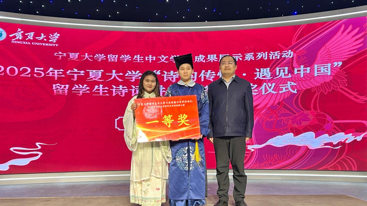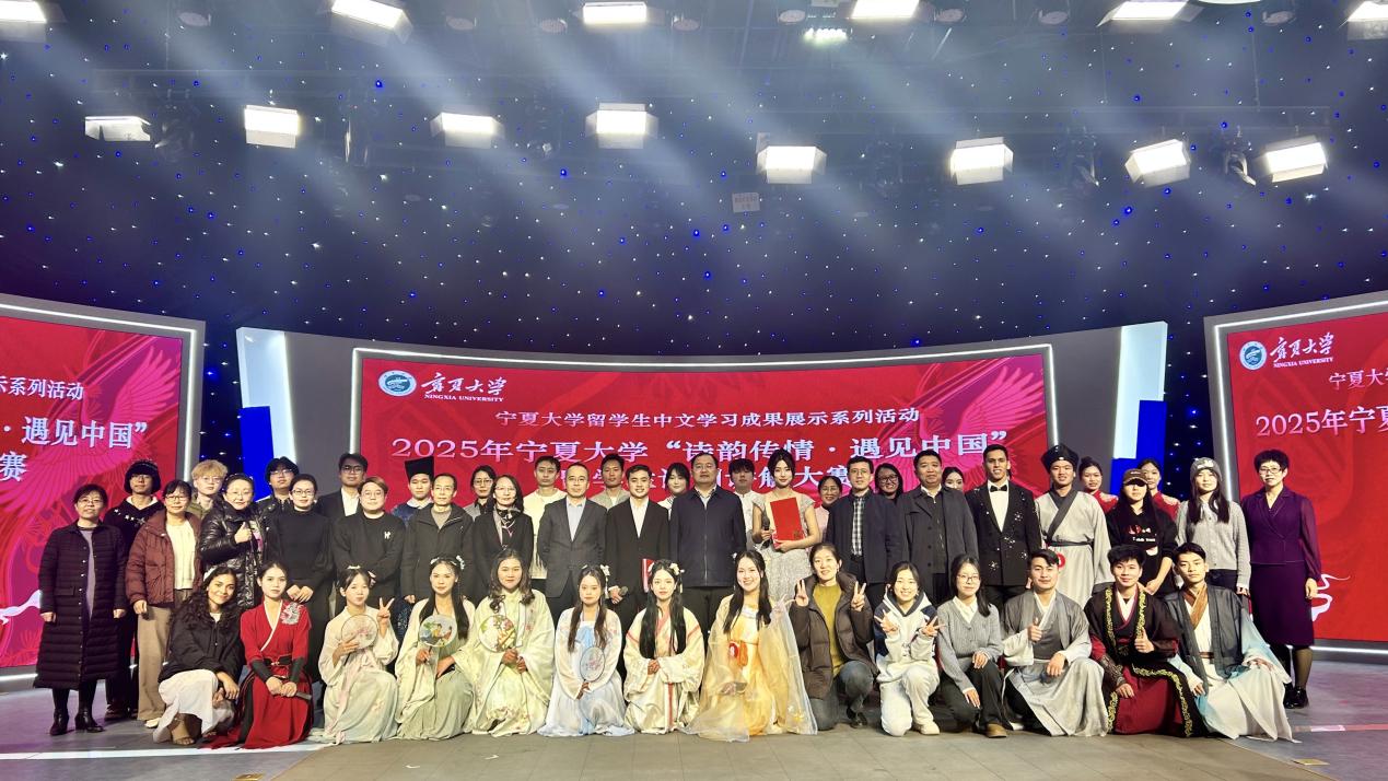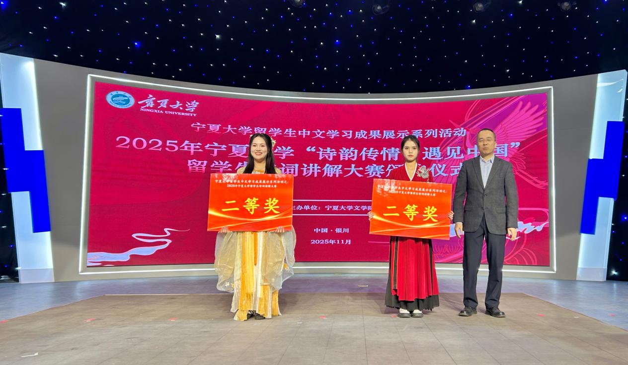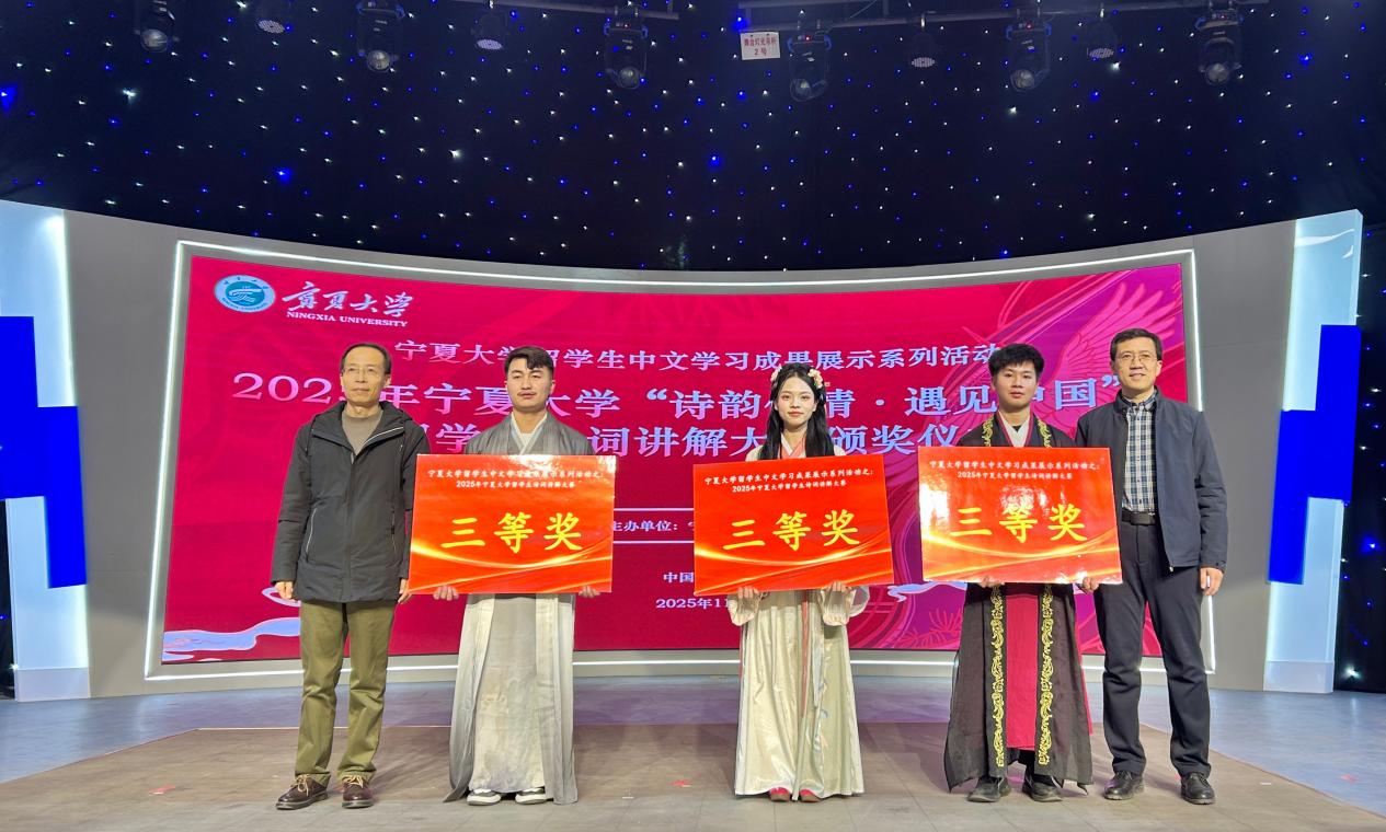 【宁夏大学新闻中心讯 文学院】11月26日下午,宁夏大学“诗韵传情·遇见中国”留学生诗词讲解大赛在贺兰山校区新闻传播学院演播厅举行。本次活动由宁夏大学文学院主办,校党委常委、副校长杨文法,学校对外合作交流处、国际教育学院、文学院、音乐舞蹈学院、守正书院、尚德书院相关领导和老师与来自厄瓜多尔、印度尼西亚、越南、老挝、埃及等国的留学生们共同见证了一场以诗词为媒介、融汇中外文化的精彩盛会。