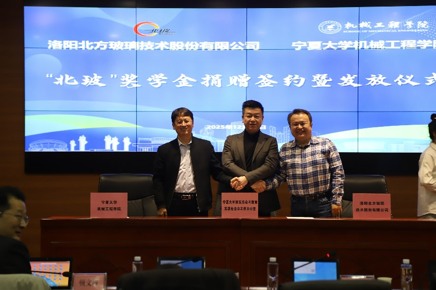 【宁夏大学新闻中心讯 机械工程学院】12月10日,洛阳北方玻璃技术股份有限公司(以下简称“北玻股份”)与机械工程学院在贺兰山校区致远楼联合举办校企合作系列活动。本次活动通过座谈签约、奖学金颁发、企业宣讲及毕业生面试等环节,构建“育人-就业”一体化协同平台,全面助力机械工程学院高素质人才培养。