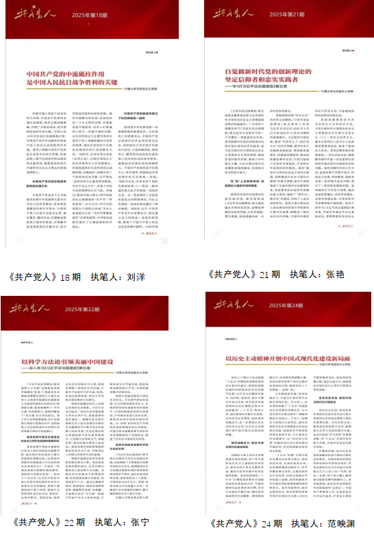 学院师生以党的创新理论和重大历史节点为指引,从纪念中国人民抗日战争暨世界反法西斯战争胜利80周年,到学习《习近平谈治国理政》第五卷,再到聚焦党的二十届四中全会和自治区十三届历次全会精神,将理论感悟转化为学术成果,在《共产党人》杂志中持续发声。刘洋老师在宁夏党刊《共产党人》中刊发的《中国共产党的中流砥柱作用是中国人民抗日战争胜利的关键》一文,回望中国人民抗日战争的伟大历程,深刻解读中国共产党在抗日战争中的伟大贡献;张艳老师刊发的《自觉做新时代党的创新理论的坚定信仰者和忠实实践者》一文,从“知”、“行”、“效”三个方面发出了党的创新理论要学深、悟透、讲实、践行的强大呼声;张宁老师在刊发《以科学方法论引领美丽中国建设》一文,系统阐述引领美丽中国建设的科学方法论,以深学细悟、知行合一态度为美丽中国建设发声发力;范映渊老师刊发的《以历史主动精神开创中国式现代化建设新局面》一文,深入解读党的二十届四中全会精神,为迎接“十五五”开局唱响了坚定历史自信和文化自信的先声。
